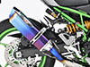 - 新騒音規制に対応する為、新型サブサイレンサーを採用しながらも4 in 1スタイルを表現し、ストレート排気パルスコ ーンシステムにより迫力のサウンドで、加速・近接排気音量規制クリア。(近接排気音認証値93dB)